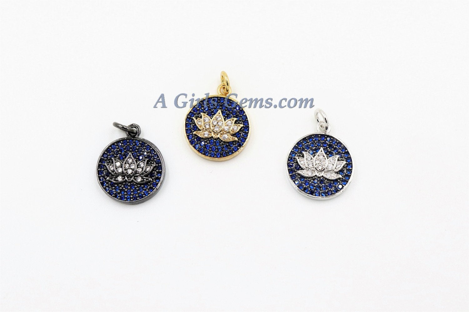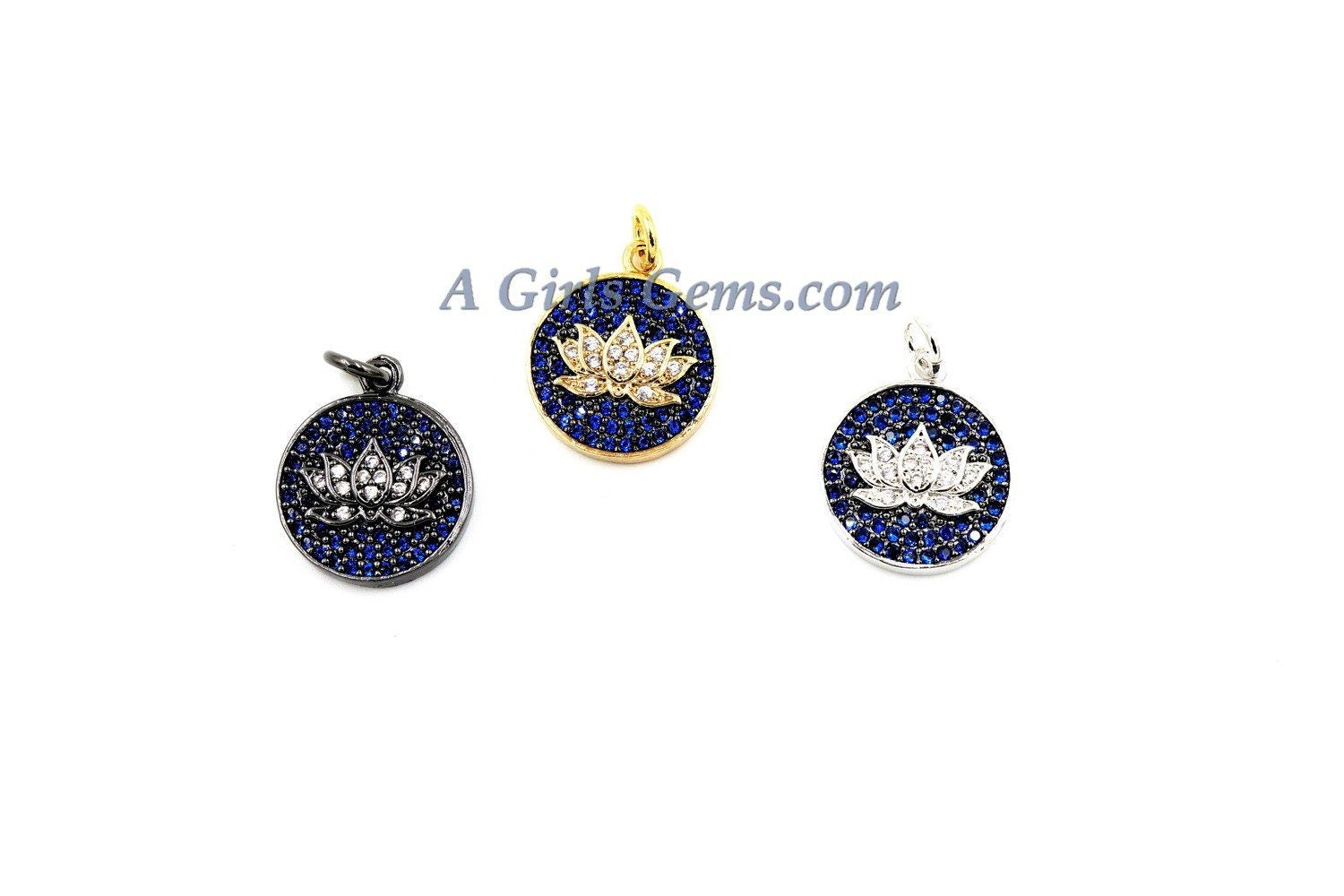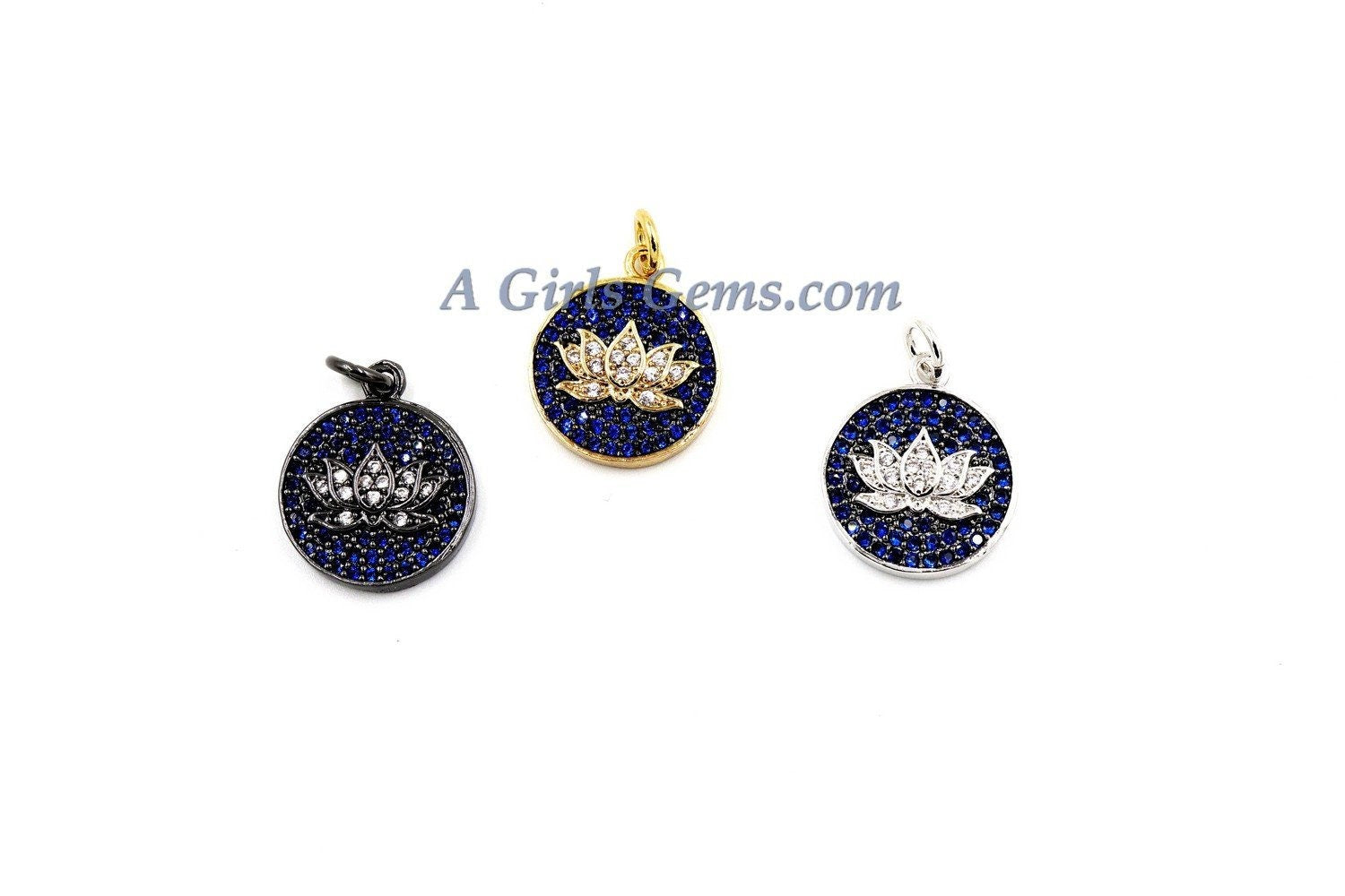 CZ Micro Pave Disc Lotus Flower Charm, CZ Yoga Charms 11 x 14 mm, Cobalt Blue Lotus Flower Charm, *ALL Colors* Silver, Rose, Gold AGG271