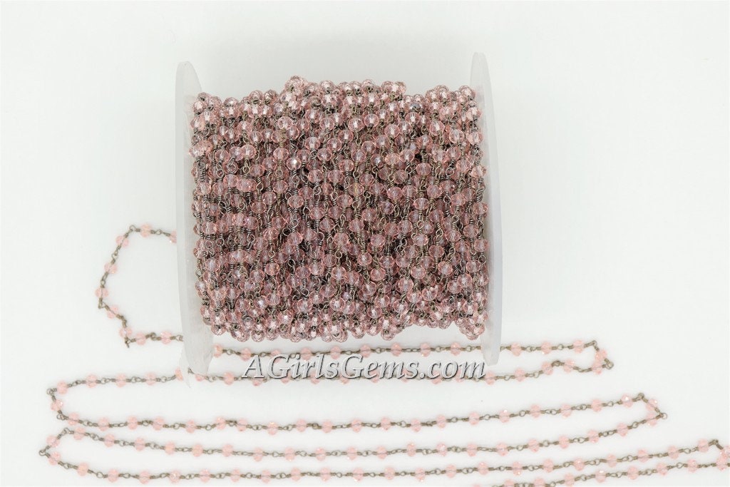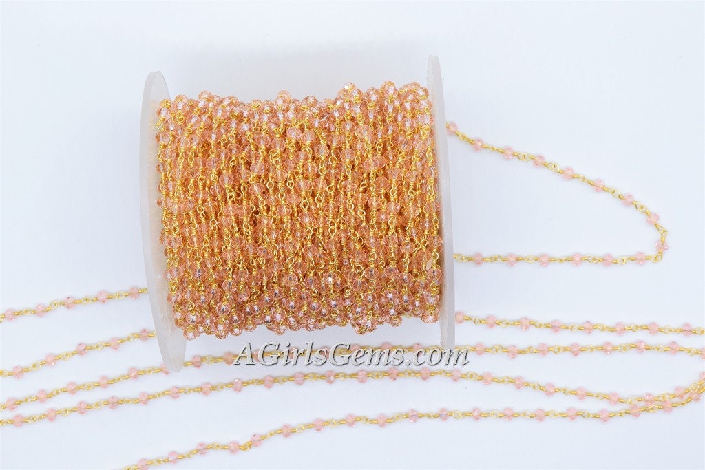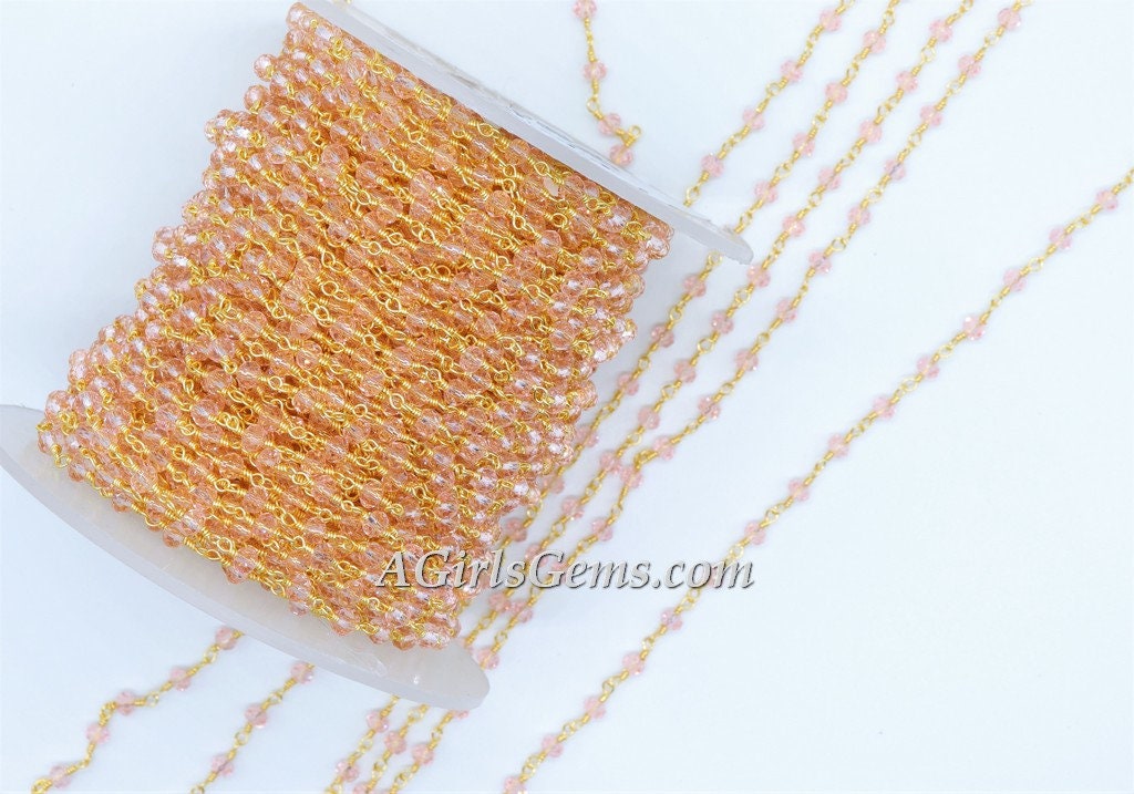 Pink Crystal Rosary Chain, 4 mm Gold Wire Wrapped CH #331, Rondelle Beaded Religious Chains