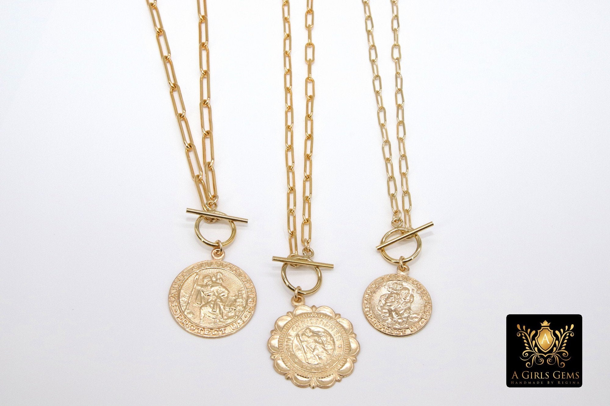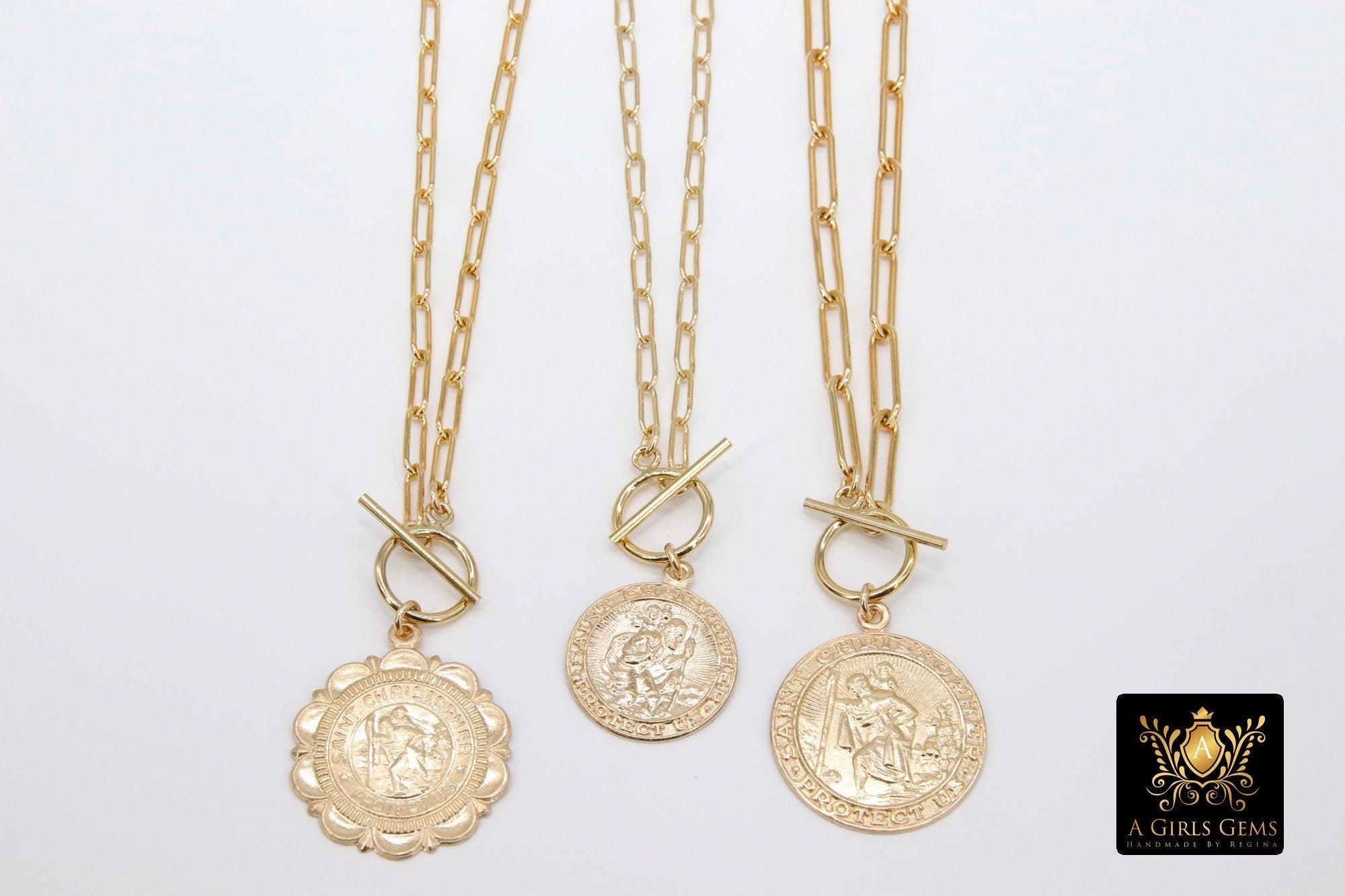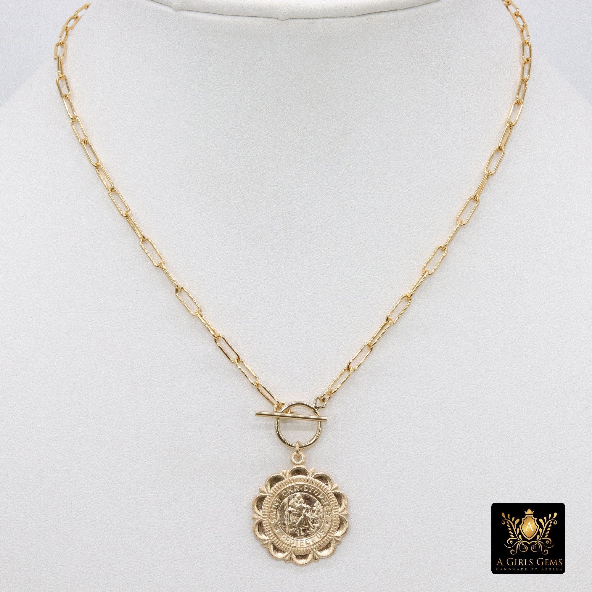 This necklace is on our 14 K Gold Filled Designer Rectangle Oval Drawn Chains as seen in picture 1, ***NOT plated *** will last a lifetime. Includes a 14 K Gold Filled Toggle. St. Christopher coin charm. Our most popular lengths are below. If you need a different length, please message us with any questions.