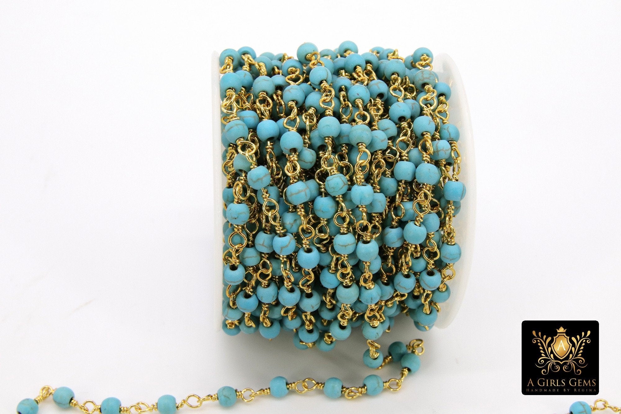 Turquoise Rosary Beaded Chain, 4 mm Wire Wrapped Silver plated Blue Howlite Chain for Necklace Bracelets