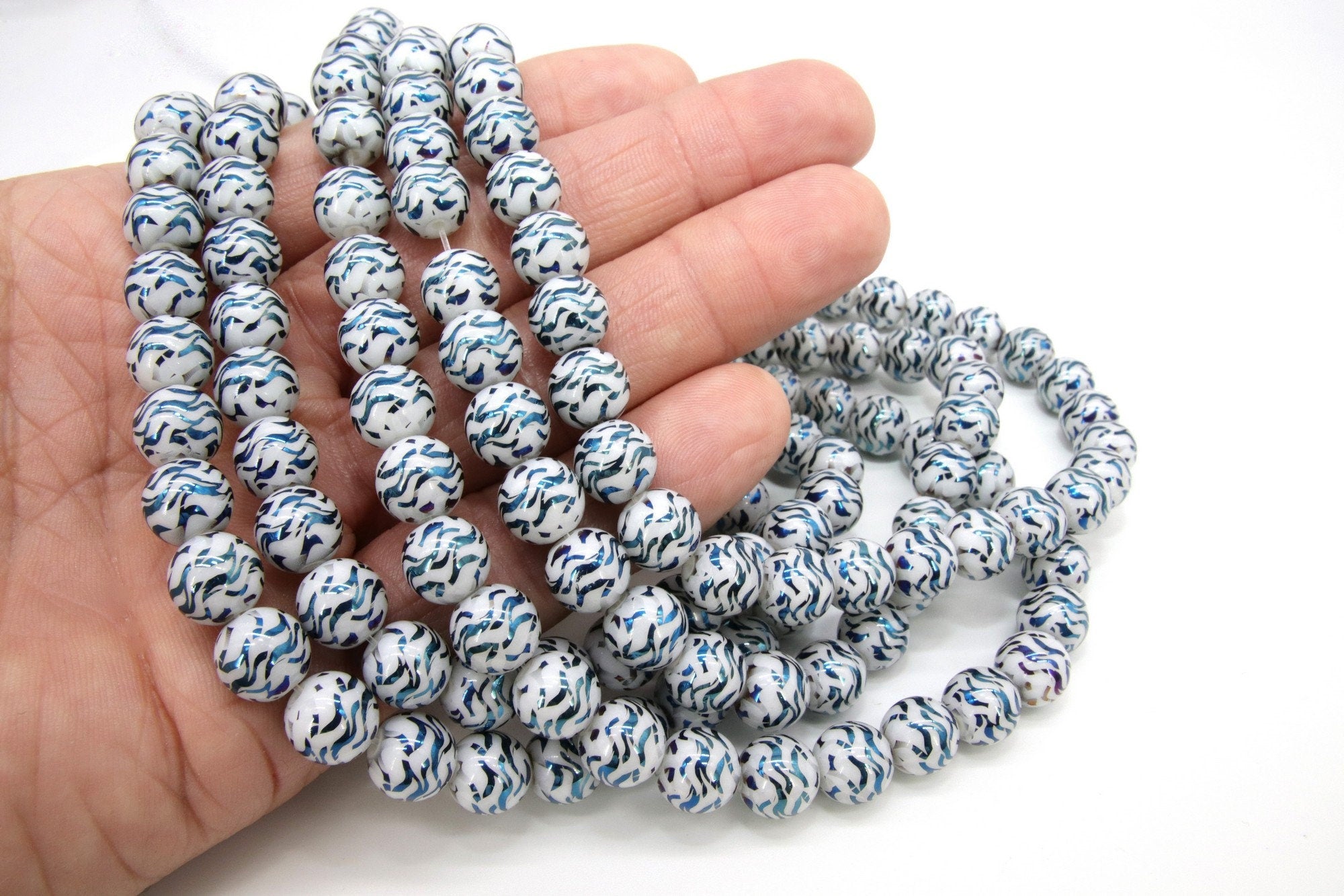 White and Sky Blue Beads, Shimmery Wave Pattern Smooth Tiger Stripe Beads BS #45, sizes 10 mm 11 inch Strands